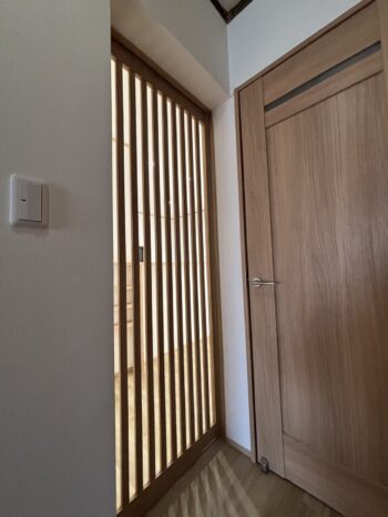 キッチンの入口です。格子状の扉が中にいる人の気配を感じる事が出来ます。