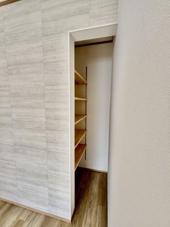 リビングはテレビ設置場所の裏に収納スペースを確保しました。