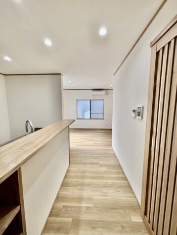 キッチン入口からリビングの様子です。広々とした通路幅です。