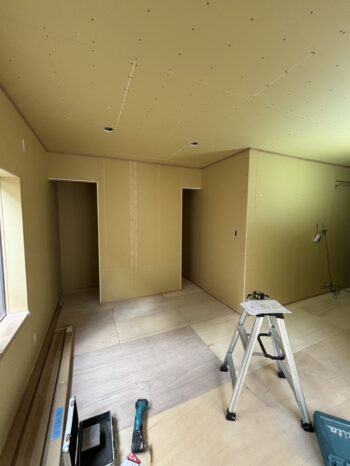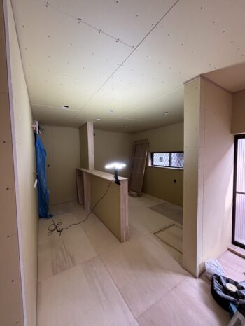 リビングの様子も見えてきました。今回はテレビ裏収納も作ります。