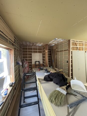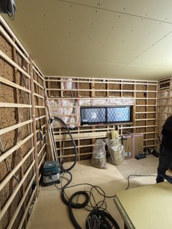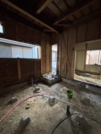 キッチン壁下地の様子。活かせる断熱材は活かし、床も天井もしっかり断熱材を仕込んでいきます。窓も取替済みです。