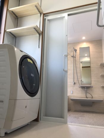 三枚引き戸の入口でより入りやすい浴室に変身♪洗濯機横には棚を設置!